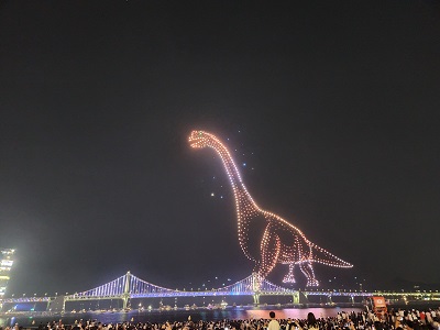 광안대교의 불빛과 공룡모습의 드론이 잘어우러져 밤하늘 멋진 그림을 그려줍니다.