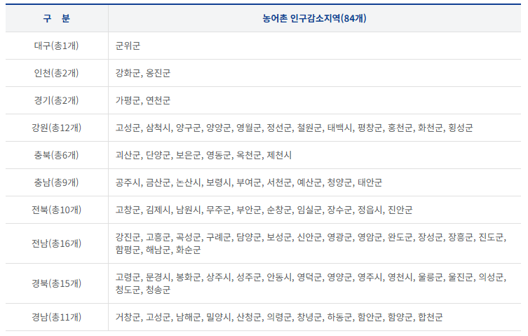 1차 민생회복 소비쿠폰의 경우 농어촌 인구감소지역 주민에게 5만원을 추가로 지급할 예정이며 기준해당지역은 다음과 같습니다.